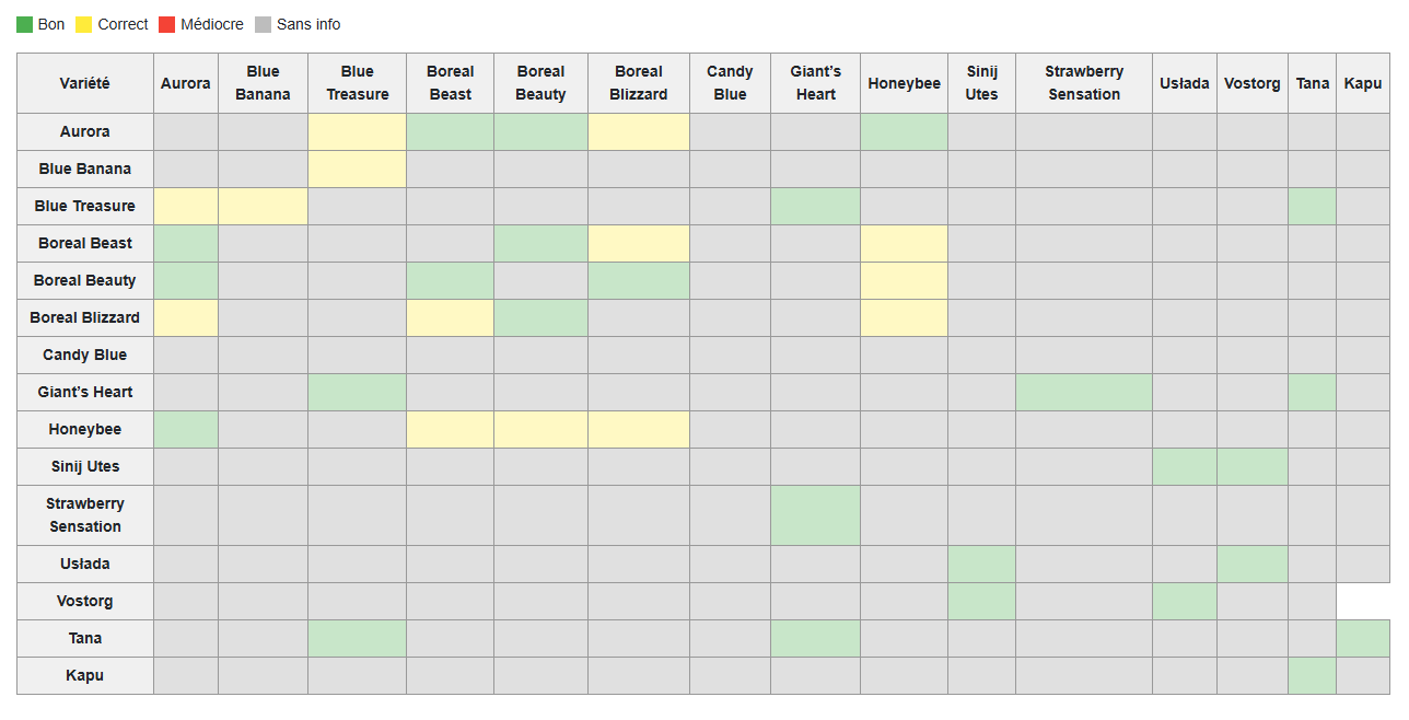 ⚠️ Ces cinq cultivars sont proches génétiquement et ne se pollinisent pas entre eux. Associe-les avec Aurora, Honey Bee, Berry Blue ou Vostorg. - Tardifs (fin juin–fin juillet) : Boreal Blizzard, Boreal Beast, Boreal Beauty.